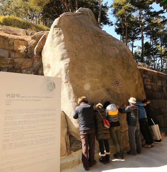 µ¿ÀÇÀüÀÇ Çѹæ±âüÇèÀå¿¡´Â ÇÏ´ÃÀÇ ±â¿îÀ» ¹Þ´Â ¼®°æ, ¶¥ÀÇ ±â¿îÀ» ¹Þ´Â ±Í°¨¼®, º¹À» ´ã´Â ±×¸© º¹¼®Á¤ µî 3¼®ÀÌ Á¶¼ºµÅ ÀÖ´Ù. ÀÌ µ¹µéÀº °ü¶÷°´µéÀº ÁÁÀº ±â¸¦ ¹Þ±â À§ÇØ ÁÙÁö¾î ã´Â ¸í¼Ò´Ù. |
