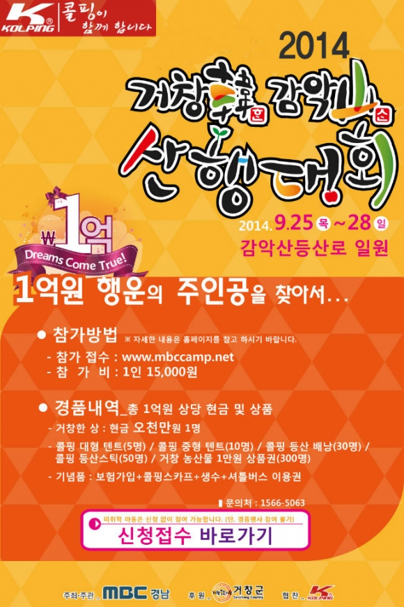 °¡º±°Ô »êÇàÇϰí ÃàÁ¦µµ Áñ±â¸ç Çà¿îµµ ¹Þ¾Æ°¡´Â 1¼® 3Á¶ÀÇ ‘2014 °ÅâÇÑ °¨¾Ç»ê Àü±¹»êÇà´ëȸ’ Âü°¡½ÅûÀº ȨÆäÀÌÁö(www.mbccamp.net)¿¡¼ ½Åû°¡´ÉÇϸç ÀÚ¼¼ÇÑ ¹®ÀÇ´Â ¢Ï1566-6063À¸·Î ÇÏ¸é µÈ´Ù. |