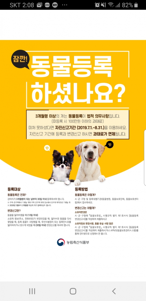 ¿À´Â 9¿ùºÎÅÍ´Â ¹Ý·Áµ¿¹°À» µî·ÏÇÏÁö ¾Ê´Â °æ¿ì ÃÖ´ë 60¸¸ ¿øÀÇ °úÅ·ᰡ ºÎ°úµÇ¸ç µ¿¹°µî·ÏÀº ³»ÀåÇü ¹«¼±½Äº°ÀåÄ¡ »ðÀÔ, ¿ÜÀåÇü ¹«¼±½Äº°ÀåÄ¡ ¶Ç´Â ÀνÄÇ¥¸¦ ºÎÂøÇØ¾ßÇϸç, ³ó¾÷±â¼ú¼¾ÅÍ ³ó¾÷Ãà»ê°ú¿¡ °¡Ãà¹æ¿ª´ã´ç(¢Ï940-8145)À¸·Î ¹æ¹®ÇÏ¸é µÈ´Ù.