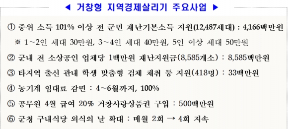 À̹ø ¡®Áö¿ª°æÁ¦»ì¸®±â Á¾ÇÕ´ëÃ¥¡¯¿¡´Â ±¹°¡¿Í °æ³²µµ Áö¿ø¿¡¼ Á¦¿ÜµÈ ±º¹ÎÀ» Áö¿øÇÔÀ¸·Î½á Àü ±º¹ÎÀÌ ºüÁü¾øÀÌ Áö¿øÀ» ¹ÞÀ» ¼ö ÀÖµµ·Ï °æÁ¦ »ç°¢Áö´ë¸¦ ÇØ¼ÒÇϰí, °Åâ Ư»ö¿¡ ¸Â´Â ¼Ò»ó°øÀΠƯº°Áö¿ø´ëÃ¥À» ¼ö¸³ÇÔÀ¸·Î½á ¾î·Á¿òÀ» °Þ°í ÀÖ´Â ¼Ò»ó°øÀÎÀÇ °æÁ¦Àû À§±â ±Øº¹¿¡ ÃÊÁ¡À» ¸ÂÃè´Ù.