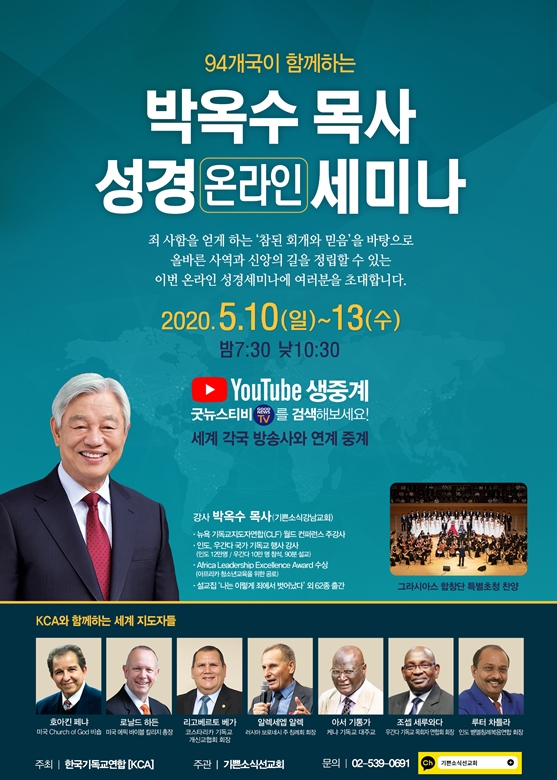 Çѱ¹±âµ¶±³¿¬ÇÕ(KCA; Korea Christian Association)ÀÌ ÁÖÃÖÇÏ°í ±â»Û¼Ò½Ä¼±±³È¸°¡ ÁÖ°üÇÏ´Â ¡®¹Ú¿Á¼ö ¸ñ»ç ¿Â¶óÀÎ ¼º°æ¼¼¹Ì³ª¡¯´Â 5¿ù 10ÀÏ(ÀÏ)ºÎÅÍ 13ÀÏ(¼ö)±îÁö ÀÎÅͳݹæ¼Û¡®GOODNEWS TV¡¯À¯Æ©ºê ä³Î°ú °ø½Ä ¾îÇø®ÄÉÀ̼ÇÀ» ÅëÇØ Àü ¼¼°è¿¡ »ýÁß°èµÇ¸ç, µ¿½Ã¿¡ °¢±¹ÀÇ ¹æ¼Û°úµµ ¿¬°èÇØ Áß°èµÈ´Ù.