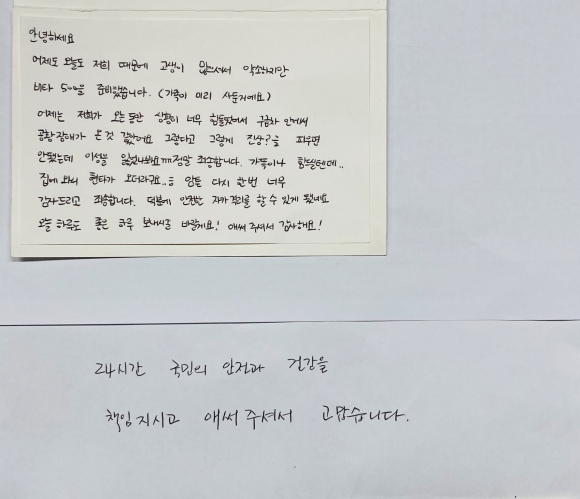 ¼Ò¹æ¼¿¡ µû¸£¸é Áö³ 1Àϰú 2ÀÏ¿¡ ÀÚ°¡°Ý¸®¸¦ À§ÇØ ÀÌ¼ÛµÈ ÇØ¿ÜÀÔ±¹ÀÚµéÀÌ °¨»çÀÇ ÆíÁö¸¦ º¸³Â´Ù. Àü´ÞµÈ ¼ÕÆíÁö¿¡´Â ¡°´öºÐ¿¡ ¾ÈÀüÇÑ ÀÚ°¡°Ý¸®¸¦ ÇÒ ¼ö ÀÖ¾ú½À´Ï´Ù¡±¸ç ¡°24½Ã°£ ±¹¹ÎÀÇ ¾ÈÀü°ú °Ç°À» Ã¥ÀÓÁö°í ¾Ö½áÁּż °í¸¿½À´Ï´Ù¡±°í ÀûÇô ÀÖ¾ú´Ù.