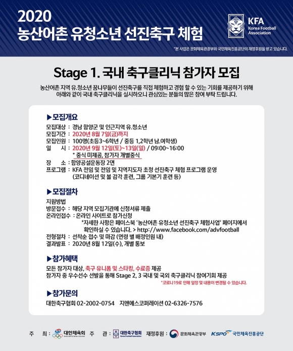 ½ºÅ×ÀÌÁö2, 3Àº ¿À´Â 10¿ù ½ºÅ×ÀÌÁö 1¿¡¼ ¼±¹ßµÈ À¯¡¤Ã»¼Ò³â 100¸íÀ» ´ë»óÀ¸·Î ÇØ¿ÜÃÊû ÁöµµÀÚ¿Í ÇÔ²²ÇÏ´Â ±¹³» ÃÖ°íÀÇ Ã౸ Ŭ¸®´Ð üÇèÀÇ ±âȸ°¡ Á¦°øµÈ´Ù. ½ÅûÀº ÇԾ籺üÀ°È¸(964-7330) ¹× ÇԾ籺û(960-4610)¿¡ ¹æ¹®Á¢¼öÇϰųª ¿Â¶óÀÎ »çÀÌÆ®¿¡¼ ½ÅûÇÏ¸é µÈ´Ù. ÀÚ¼¼ÇÑ »çÇ×Àº ÆäÀ̽ººÏ(https://www.facebook.com/advfootball)À» Âü°íÇÏ¸é µÈ´Ù.