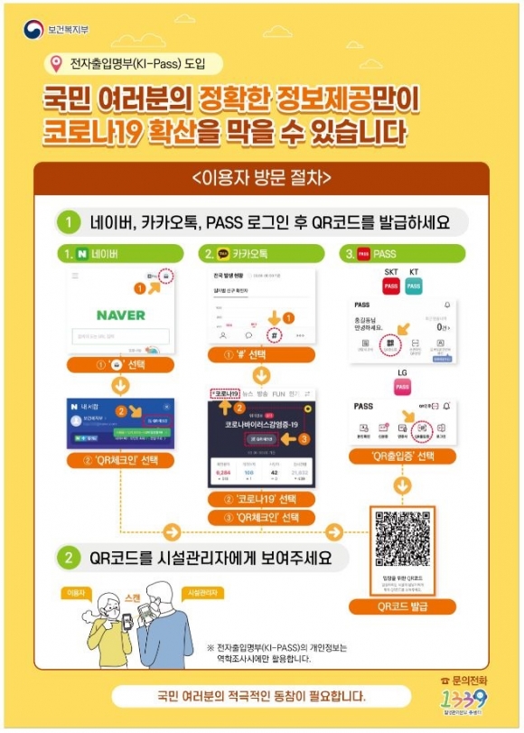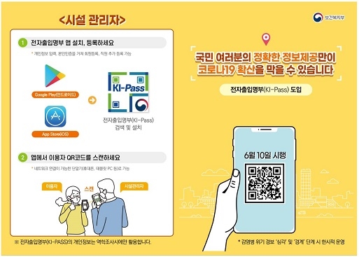 ¶ÇÇÑ, ÇØ´ç½Ã¼³ ÀÌ¿ëÀÚ ¿ª½Ã ½º¸¶Æ®ÆùÀ» ÅëÇØ °³ÀÎ QRÄڵ带 ¹ß±Þ¹Þ¾Æ ÀüÀÚÃâÀÔ¸íºÎ ´Ü¸»±â¿¡ ½ºÄµÇÏ¿© ÃâÀÔÀ» ÇØ¾ß ÇÑ´Ù. ÀÎ½ÄµÈ Á¤º¸´Â ¾÷¼Ò¿¡ ³²Áö ¾Ê°í »çȸº¸ÀåÁ¤º¸¿ø¿¡ Àü¼ÛµÇ¾î °¨¿°º´ °ü¸®¸¦ À§ÇØ »ç¿ëµÈ µÚ 4ÁÖ ÈÄ ÀÚµ¿ Æó±âµÈ´Ù.