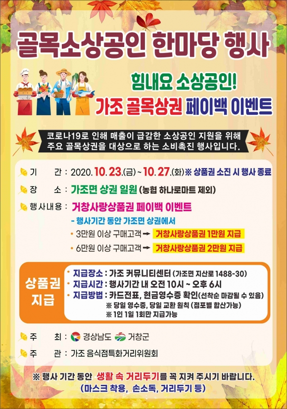 °æ³²µµÀÇ Áö¿øÀ» ¹Þ¾Æ °¡Á¶À½½ÄÁ¡Æ¯È°Å¸®À§¿øÈ¸°¡ ÁÖ°üÇÏ´Â À̹ø Çà»ç´Â Äڷγª19ÀÇ È®»ê ¿¹¹æÀ» À§ÇØ »ç¶÷µéÀÌ ¹ÐÁýÇÏ´Â Çà»ç¸¦ Áö¾çÇÏ´Â ´ë½Å »óǰ±Ç ÆäÀ̹é À̺¥Æ®¸¦ ÁøÇàÇØ ¼Òºñ ÃËÁø ºÐÀ§±â¸¦ Á¶¼ºÇϰí Áö¿ª »ó±Ç Ȱ¼ºÈÀÇ °è±â¸¦ ¸¶·ÃÄÚÀÚ ÇÏ´Â µ¥ ±× ¸ñÀûÀÌ ÀÖ´Ù.