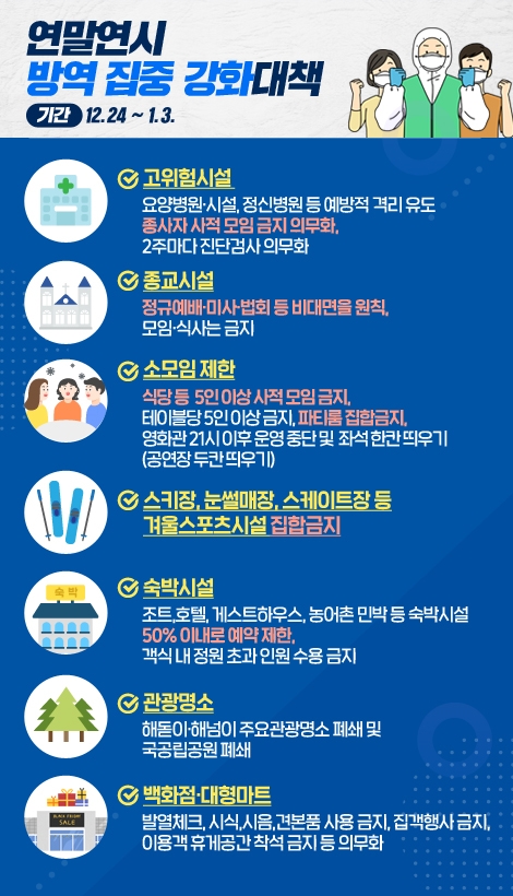 ¶ÇÇÑ, ¿¬¸»¿¬½Ã¿¡ ÀÎÆÄ°¡ ¸ô¸®´Â ÁÖ¿ä °ü±¤¸í¼Ò ¹× ±¹°ø¸³°ø¿ø µîÀº Àü¸é Æó¼âµÇ¸ç, ´ë±Ô¸ð Áý´Ü°¨¿°ÀÌ °è¼ÓµÇ°í ÀÖ´Â ¿ä¾çº´¿ø, ¿ä¾ç½Ã¼³ µî Ãë¾à½Ã¼³Àº ¿ÜºÎÀÎ ÃâÀÔÅëÁ¦, Á¾»çÀÚ »çÀû¸ðÀÓ ±ÝÁö, 2ÁÖ¸¶´Ù ¼±Á¦°Ë»ç¸¦ ½Ç½ÃÇÏ°Ô µÈ´Ù.