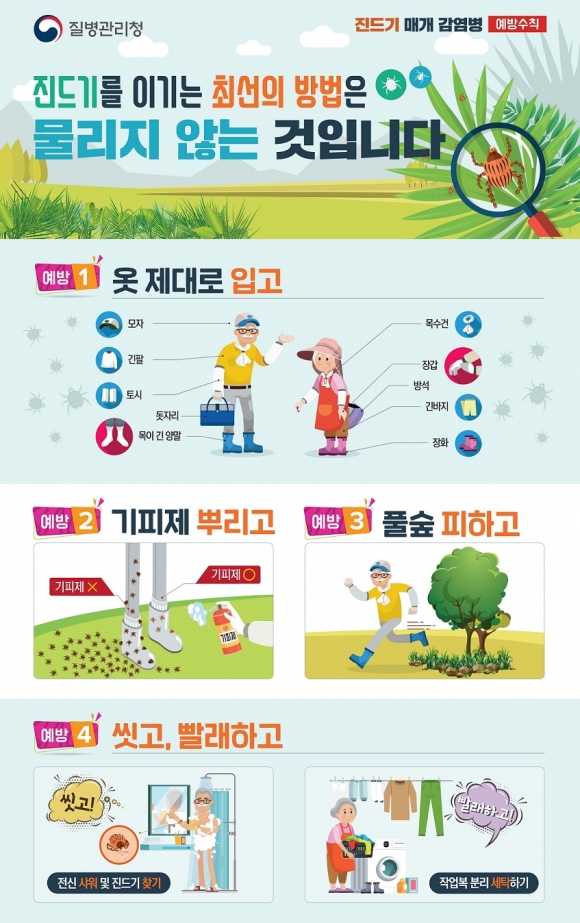 ¿¹¹æÀ» À§Çؼ´Â ¡ã¾ß¿Ü Ȱµ¿ ÈÄ Áï½Ã ¸ñ¿åÇÏ°í ¿ÊÀº ¹Ýµå½Ã ¼¼Å¹Çϱ⠡ã±äÆÈ, ±ä ¿Ê Âø¿ëÇϸç Áøµå±â ±âÇÇÁ¦ »ç¿ëÇϱ⠡ãÇ®¹çÀ§¿¡ ÇԺηΠ¾É°Å³ª ´¯Áö ¸»°í ¿Ê ¹þ¾îµÎÁö ¾Ê±â ¡ã¸ö¿¡ ºÙÀº Áøµå±â ¹ß°ß ½Ã ¹«¸®ÇÏ°Ô Á¦°ÅÇÏÁö ¸»°í ÀÇ·á±â°ü ¹æ¹®ÇÏ±â µî ¿¹¹æ¼öÄ¢À» ÁؼöÇØ¾ß ÇÑ´Ù.