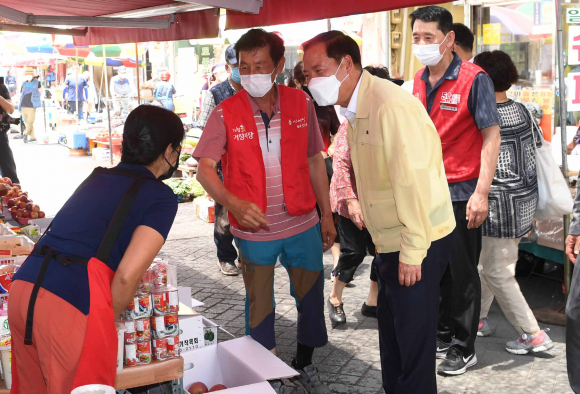 °Åâ½ÃÀåÀ» ã¾Æ Äڷγª19·Î ¾î·Á¿òÀ» °Þ°í ÀÖ´Â »óÀεéÀ» °Ý·ÁÇϰí, ¼Ò»ó°øÀε鿡°Ô ½ÇÁúÀûÀ¸·Î ÇÊ¿äÇÑ Áö¿øÃ¥ ¸¶·ÃÀ» À§ÇØ ½ÃÀå¹ø¿µÈ¸ ȸ¿øµé°ú ¼ÒÅëÀÇ ½Ã°£µµ °¡Á³À¸¸ç, ½ÃÀåÀ» ¹æ¹®ÇÑ ±º¹Îµé¿¡°Ô´Â Äڷγª19 È®»ê¹æÁö¸¦ À§ÇØ ¹æ¿ª Áöħ¿¡ Àû±Ø ÇùÁ¶ÇØ ÁÖ½Ç °ÍÀ» ´çºÎÇß´Ù.