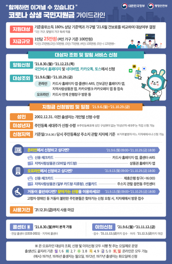 Áö±Þ´ë»ó Á¶È¸ ¹× ½ÅûÀº ¿À´Â 6ÀϺÎÅÍ ¿Â¶óÀÎ, 13ÀϺÎÅÍ´Â Ä«µå»ç ¿¬°è ÀºÇàⱸ³ª À¾¡¤¸é»ç¹«¼Ò¿¡¼ °¡´ÉÇϸç 10¿ù 29ÀÏ¿¡ ¸¶°¨ÇÑ´Ù.