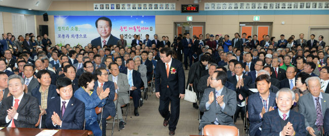 Àü±¹ 8°³ ÀÚÄ¡´ÜüÀÇ À纸±È ¼±°Å¿¡¼ À¯ÀÏÇÏ°Ô ¹«¼Ò¼Ó È常¦ ´ç¼±½ÃÄÑÁØ °Åⱺ¹ÎÀÇ ¼±Åÿ¡ ´ëÇÑ °¨»çÀλ縦 ÃëÀÓ»çÀÇ ¸Ç ¾Õ¿¡ ´ã¾Ò´Ù. 2³âÀÇ Àӱ⸦ 20³âó·³ ¾²°Ú´Ù´Â °¢¿À¸¦ ¹àÈù ÃëÀÓÀλ翡¼ ¹Î¼± 6±âÀÇ »ç¾÷µé¿¡ ´ëÇÑ ¹ßÀüÀû ½Â°è¸¦ ¾ð±ÞÇÏ¸ç ±ºÁ¤ÀÇ ¿¬¼Ó¼ºÀ» °Á¶Çß´Ù.