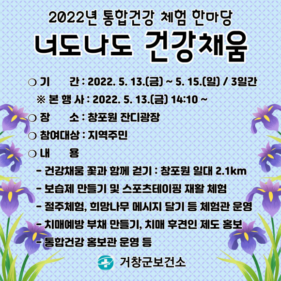 °ÅⱺÀº ±º¹ÎµéÀÇ °Ç°»ýȰ½Çõ ºÐÀ§±â Á¶¼ºÀ» À§ÇØ 2022³â ÅëÇհǰ ÇѸ¶´ç ¡®³Êµµ³ªµµ °Ç°Ã¤¿ò¡¯ Çà»ç¸¦ 5¿ù 13ÀϺÎÅÍ 3Àϰ£ âÆ÷¿ø ÀÏ´ë¿¡¼ °³ÃÖÇÑ´Ù.