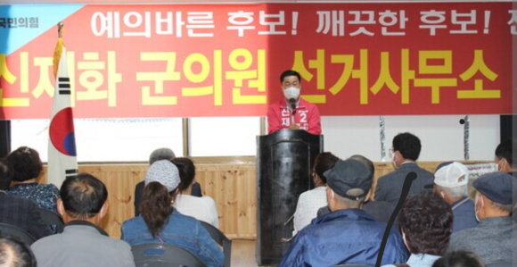 °ÅⱺÀÇ¿ø ³ª¼±°Å±¸(°ÅâÀ¾ »óµ¿.ÁÖ»ó.¿õ¾ç.°íÁ¦.ºÏ»ó.À§Ãµ.¸¶¸®)¿¡ Ãâ»çÇ¥¸¦ ´øÁø ±¹¹ÎÀÇÈû ½ÅÀçÈ È帰¡ Áö³ 5ÀÏ(¸ñ) °ÅâÀ¾ »ó¸²¸® ¼ÒÀç ÀÚ½ÅÀÇ ¼±°Å»ç¹«¼Ò¿¡¼ ´ç¿ø ¹× ÁöÁöÀÚ µîÀÌ Âü¼®ÇÑ ´ë°Å °¡¿îµ¥ ¼±°Å»ç¹«¼Ò °³¼Ò½ÄÀ» ¿°í ÈûÂù Ãâ¹ßÀ» ¾Ë·È´Ù. ½Å È帴 ÀÌ ÀÚ¸®¿¡¼ ¡®ÀÚ½ÅÀº Áö³ 2018³â Áö¿ªÀÇ ¸¹Àº ºÐµéÀÇ µµ¿ò°ú ÀÀ¿ø¿¡ ÈûÀÔ¾î °ÅⱺÀÇ¿ø¿¡ ´ç¼±µÇ¾î ³ª¸§´ë·Î Áö¿ª¹ßÀüÀ» À§ÇØ ³ª¸§´ë·Î ÃÖ¼±À» ´ÙÇß´Ù¡¯¸é¼ À̹ø ¼±°Å¸¦ ÅëÇØ ´Ù½Ã ÇÑ ¹ø ±âȸ°¡ ÁÖ¾îÁø´Ù¸é ¾ÕÀ¸·Î ´õ ¿½ÉÈ÷ ¶Ù°í ÈûÀÌ µÇ´Â ±ºÀÇ¿øÀÌ µÇ°Ú´Ù¡®¸ç Æ÷ºÎ¸¦ ¹àÇû´Ù.
