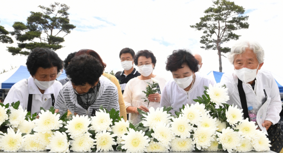 ¿ÀÀü 10½Ã Àü±¹ µ¿½Ã¿¡ ¿ï¸®´Â »çÀÌ·»¿¡ ¸ÂÃç 1ºÐ°£ ¼ø±¹¼±¿°ú È£±¹¿µ·É¿¡ ´ëÇÑ ¹¬³äÀ» ½ÃÀÛÀ¸·Î ÇåÈ¿Í ºÐÇâ, Ãß³ä»ç, Ã߸ðÇå½Ã ³¶¼Û, ÇöÃæÀÏ ³ë·¡ Á¦Ã¢ ¼øÀ¸·Î ÁøÇàµÆ´Ù. À̳¯ Ãß³ä½Ä¿¡¼ ±¸Àθð °Åⱺ¼ö´Â ¡°±¹°¡¿Í ±¹¹ÎÀ» À§ÇÑ Èñ»ý°ú Çå½Å¿¡ ´ëÇØ¼´Â ¹Ýµå½Ã º¸´äÀ» ÇØ¾ß ÇÑ´Ù¡±¸ç, ¡°¼ø±¹¼±¿°ú È£±¹¿µ·ÉÀÇ Èñ»ýÀÌ ÇêµÇÁö ¾Êµµ·Ï ±¹°¡À¯°øÀÚ¿Í À¯°¡Á·¿¡ ´ëÇÑ º¹ÁöÁõÁøÀ» ´õ¿í ³ë·ÂÇØ ³ª¾Æ°¡°Ú´Ù¡±°í ¸»Çß´Ù. ½ÅÅ¿ì Àü¸ô±º°æÀ¯Á·È¸ ÁöȸÀåÀº ¡°Áö³ 2³â°£ Äڷγª19·Î ÀÎÇÑ ¾î·Á¿ò ¼Ó¿¡¼ ´ÜÇÕµÈ ÈûÀ» º¸¿©ÁÖ´Â À§´ëÇÑ ±¹¹Î¼ºÀ¸·Î ¸ðµç °ÍÀ» À̰ܳ»¾î À̹ø Ãß³ä½ÄÀ» ¿ ¼ö ÀÖ°Ô µÈ °ÍÀ» ¶æ±í°Ô »ý°¢ÇÑ´Ù¡±¸ç, ¡°Çѱ¹ÀüÀï ÈÄ 72³âÀ̶ó´Â ±ä ¼¼¿ù ¼Ó¿¡ ¾ÆÁ÷µµ ¾Æ¹öÁö, ³²ÆíÀÇ À¯Çظ¦ ãÁö ¸øÇØ ¾ÖÅ¿ì¸ç °£ÀýÇÑ ¸¶À½À¸·Î ±â´Ù¸®´Â À¯°¡Á·µéÀ» À§ÇØ ÇÏ·ç »¡¸® ¸ðµç À¯Çذ¡ ¹ß±¼µÇ°í ½Å¿øÀÌ È®ÀÎµÇ¾î °¡Á·ÀÇ Ç°À¸·Î µ¹¾Æ°¡±æ ±â¿øÇÑ´Ù¡±°í ÀüÇß´Ù.