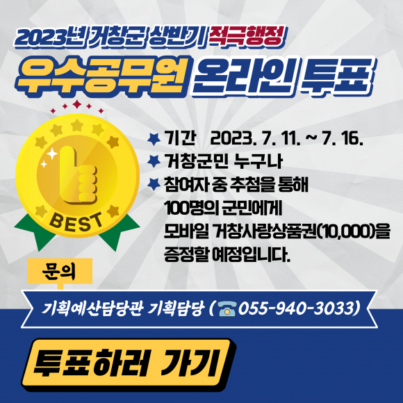 ¿Â¶óÀÎ ÅõÇ¥´Â ±ºÃ» ȨÆäÀÌÁö(geochang.go.kr)¿¡¼ ±º¹ÎÂü¿©-±º¹ÎÀÇ ¼Ò¸®-¼³¹®Á¶»ç Ç׸ñ¿¡¼ ¡®2023³â »ó¹Ý±â Àû±ØÇàÁ¤ ¿ì¼ö°ø¹«¿ø ¼±Á¤ ±º¹ÎÅõÇ¥¡¯¸¦ ¼±ÅÃÇÏ°í º»ÀÎ ÀÎÁõ ÈÄ Àû±ØÇàÁ¤ »ç·Ê 8°³ Áß 2°³¸¦ ¼±ÅÃÇÏ¸é µÈ´Ù.