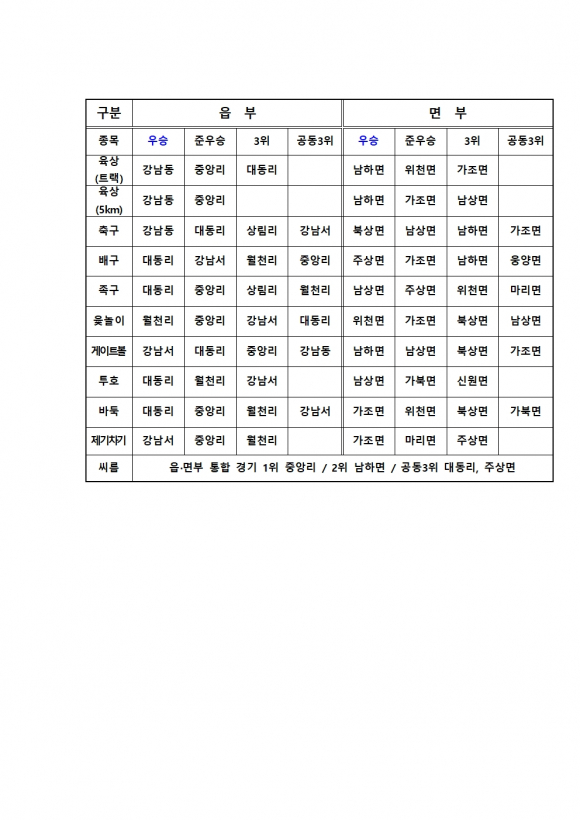 ÇÑÆí, Á¾¸ñº° À¾ºÎ ¿ì½ÂÆÀÀº °³²µ¿(À°»ó, 5km ´Þ¸®±â, Ã౸), ´ëµ¿¸®(¹è±¸, Á·±¸, ÅõÈ£, ¹ÙµÏ), ¿ùõ¸®(À·³îÀÌ), °³²¼(°ÔÀÌÆ®º¼, Á¦±âÂ÷±â), Áß¾Ó¸®(¾¾¸§)À̸ç, ¸éºÎ ¿ì½ÂÆÀÀº ³²Çϸé(À°»ó, 5km ´Þ¸®±â, °ÔÀÌÆ®º¼), ºÏ»ó¸é(Ã౸), ÁÖ»ó¸é(¹è±¸), ³²»ó¸é(Á·±¸, ÅõÈ£), À§Ãµ¸é(À·³îÀÌ), °¡Á¶¸é(¹ÙµÏ, Á¦±âÂ÷±â)ÀÌ´Ù.