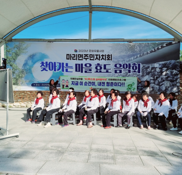 °ÅⱺÀº Áö³ 18ÀÏ °Åⱺġ¸Å¾È½É¼¾ÅͰ¡ ¡®¸¶¸®¸éÁÖ¹ÎÀÚġȸ ÁÖ°ü ã¾Æ°¡´Â ¸¶À» È¿µµ À½¾Çȸ¡¯¿¡ ÃÊû¹Þ¾Æ Ä¡¸Å¾È½É¸¶À»ÀÎ ¿µ½Â¸¶À» ÁֹΠ20¸íÀ¸·Î ±¸¼ºµÈ µÎµå¸² ½Ç¹öÀ½¾Ç´ë°¡ Çڵ座 °ø¿¬À» ÆîÃÆ´Ù°í ÀüÇß´Ù. ã¾Æ°¡´Â ¸¶À» È¿µµ À½¾Çȸ´Â ¹®È»ýȰÀ» Á¢ÇÒ ±âȸ°¡ ÀûÀº ¾î¸£½Å°ú ÁÖ¹ÎÀ» À§ÇØ ¸¶¸®¸é ÁÖ¹ÎÀÚġȸ¿¡¼ ÁÖ°üÇÏ´Â ¹®È¿¹¼ú»ç¾÷ Áß ÇϳªÀÌ´Ù. ¸¶¸®¸é ¿µ½Â¸¶À» ¾î¸£½ÅµéÀº ¿ÃÇØ 2¿ùºÎÅÍ Çڵ座 ¼ö¾÷À» ÅëÇØ ÀÎÁö±â´ÉÀ» À¯Áö¡¤ÁõÁøÇÏ°í ¿ì¿ï°¨À» ÇØ¼ÒÇßÀ¸¸ç, À̹ø °ø¿¬À» ÅëÇØ ±×µ¿¾È °¥°í´ÛÀº ½Ç·ÂÀ» ÇѲ¯ ¹ßÈÖÇÏ´Â ¶æ±íÀº ¹«´ë¸¦ ¼±º¸¿´´Ù. À½¾Çȸ¿¡ Âü¼®ÇÑ ÁֹεéÀº ¾î¸£½ÅµéÀÇ ¿Á¤ÀûÀÎ °ø¿¬¿¡ ¹Ú¼ö°¥Ã¤¸¦ º¸³»¸ç ¶ß°Å¿î È£ÀÀÀ¸·Î È´äÇß´Ù.