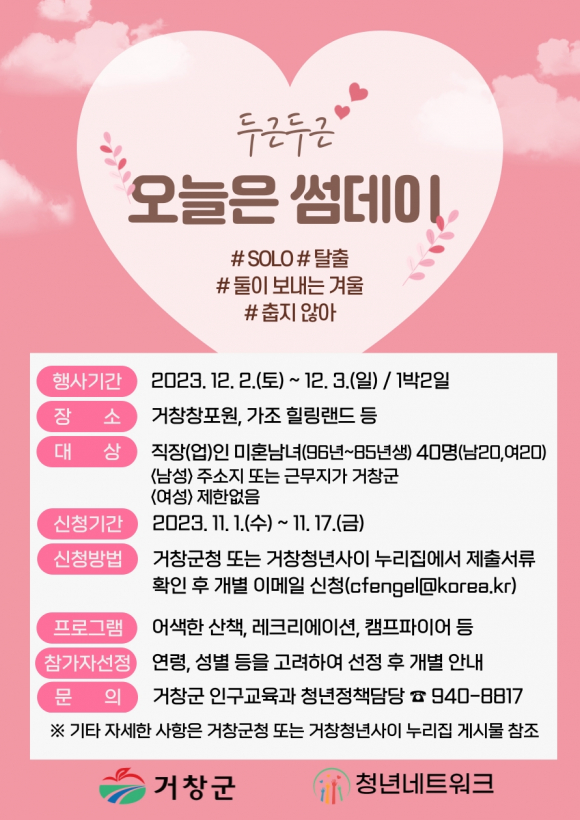 °ÅⱺÀº ¿À´Â 12¿ù 2ÀϺÎÅÍ 3ÀϱîÁö 1¹Ú 2ÀÏ·Î ÁøÇàµÇ´Â û³â ¹ÌÈ¥ ³²³à ¸¸³² Çà»ç ¡®¿À´ÃÀº ½æµ¥ÀÌ¡¯ Âü°¡ÀÚ¸¦ 11¿ù 1ÀϺÎÅÍ 17ÀϱîÁö ³²³à °¢°¢ 20¸í¾¿ ÃÑ 40¸íÀ» ¸ðÁýÇÑ´Ù.