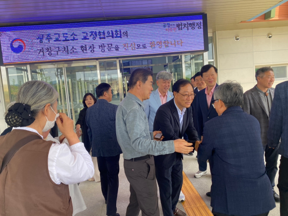 Áö³ 27ÀÏ(¿ù) 10½Ã 30ºÐ ±¤ÁÖ±³µµ¼Ò ±èµ¿¼ö »çȸº¹±Í°úÀå ¹× ±³Á¤ÇùÀÇȸ À§¿ø 30¿© ¸íÀÌ °Åⱸġ¼Ò¿Í ÇÕõ ÇØÀλ縦 ޹æÇß´Ù. ±¤ÁÖ±³µµ¼Ò À§¿øµéÀ» ¿¹¹æÇÑ °Åⱸġ¼Ò À̵µ°ï¼ÒÀå, ÃÖ¼øÅ¹È¸Àå, ±è´ö¼± »óÀÓºÎȸÀå, À̽¿ø ±³À°ºÐ°úÀ§¿øÀå, ¹èÁß¹ü »ç¹«Â÷ÀåÀº ¸Õ ±æ ¿À½Å ±¤ÁÖ±³µµ¼Ò À§¿øµéÀ» µû¶æÇÏ°Ô ¸ÂÀÌÇß´Ù.