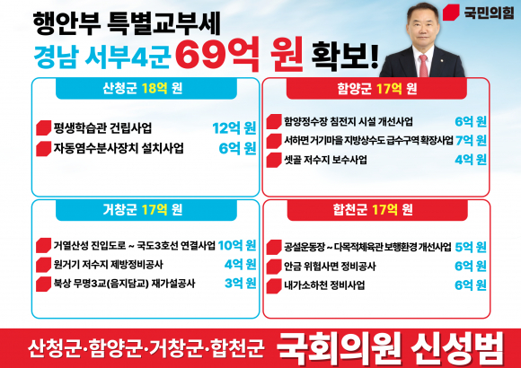 ½Å¼º¹ü ±¹È¸ÀÇ¿ø(»êû±º, ÇԾ籺, °Åⱺ, ÇÕõ±º)ÀÌ 31ÀÏ, 2024³âµµ »ó¹Ý±â °æ³² ¼ºÎ4±º Áö¿ª Çö¾È »ç¾÷°ú ÃÖ±Ù ±âÈÄÀ§±â µî Àç³ ¾ÈÀü ÇØ°áÀ» À§ÇÑ ÇàÁ¤¾ÈÀüºÎ Ưº°±³ºÎ¼¼ ÃÑ 11°³ »ç¾÷, 69¾ï¿øÀ» È®º¸Çß´Ù°í ¹àÇû´Ù. ½Å¼º¹ü ÀÇ¿øÀÌ È®º¸ÇÑ Æ¯º°±³ºÎ¼¼´Â »êû±ºÀÇ °æ¿ì Æò»ýÇнÀ°ü °Ç¸³»ç¾÷ 12¾ï¿ø, Ç×¾ç¤ý´ëÇöÁö±¸ ÀÚµ¿¿°¼öºÐ»çÀåÄ¡ ¼³Ä¡»ç¾÷ 6¾ï¿ø µî ÃÑ 18¾ï¿ø, ÇԾ籺Àº ÇÔ¾çÀú¼öÀå ½Ã¼³°³¼± 6¾ï¿ø, ¼ÇÏ¸é °Å±â¸¶À» »ó¼öµµ ±Þ¼ö È®Àå 7¾ï¿ø, ¼Â°ñÀú¼öÁö º¸¼ö»ç¾÷ 4¾ï¿ø µî ÃÑ 17¾ï¿øÀ» È®º¸ÇÏ¿´´Ù. ¶ÇÇÑ °ÅⱺÀÇ °æ¿ì °Å¿»ê¼º ÁøÀÔµµ·Î¿Í ±¹µµ3È£¼± ¿¬°á»ç¾÷À¸·Î 10¾ï¿ø, ¿ø°Å±â Àú¼öÁö Á¦¹æÁ¤ºñ 4¾ï¿ø, ºÏ»ó ¹«¸í3±³(À½Áö´ã±³) Àç°¡¼³ °ø»ç 3¾ï¿ø µî ÃÑ 17¾ï¿ø, ÇÕõ±ºÀº °ø¼³¿îµ¿Àå üÀ°°ü º¸Çàȯ°æ °³¼±»ç¾÷ 5¾ï¿ø, ¾È±Ý À§Çè»ç¸é Á¤ºñ°ø»ç 6¾ï¿ø, ³»°¡¼ÒÇÏõ Á¤ºñ»ç¾÷ 6¾ï¿ø µî ÃÑ 17¾ï¿ø ±Ô¸ð´Ù. ÀÌ·Î½á »êû, ÇÔ¾ç, °Åâ, ÇÕõ±º ¼ºÎ 4±º¿¡¼ ¾ÈÀü»ç°í°¡ ¿ì·ÁµÇ´ø Àú¼öÁö ÀÏ´ë, üÀ°°ü°ú Æò»ýÇнÀ°ü µî ÁֹΠģÈÇü ½Ã¼³¿¡ ´ëÇÑ ¿¹»ê È®º¸·Î »ýȰ¿©°Ç °³¼±ÀÌ ÀÌ·ïÁú °ÍÀ¸·Î º¸ÀδÙ.