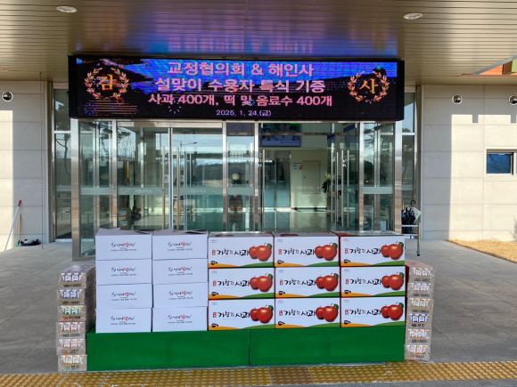 °Åⱸġ¼Ò(¼ÒÀå À̵µ°ï) ±³Á¤ÇùÀÇȸ(ȸÀå ÃÖ¼øÅ¹)´Â Áö³ 24ÀÏ(±Ý) ¿ÀÀü 11½Ã °Åⱸġ¼Ò¸¦ ã¾Æ À̹ø ¼³ ¸íÀýÀ» ¸Â¾Æ ¼ö¿ëÀÚ¿¡°Ô ÁÙ »ç°ú 400°³, ¶± 400°³ À½·á¼ö 400°³¸¦ ±âÁõÇÏ´Â Çà»ç¸¦ °¡Á³´Ù. À̳¯ °Åⱸġ¼Ò ±³Á¤ÇùÀÇȸ¿Í ºÒ±³ºÐ°ú(ÇØÀλç, Á׸²Á¤»ç)°¡ ±âÁõÇÑ ¹°Ç°Àº À̹ø ¼³ ¿¬ÈÞ ±â°£ µ¿¾È °¡Á·°ú ¶³¾îÁ® »ýȰ ÁßÀÎ ¼ö¿ëÀڵ鿡°Ô Àü´ÞµÉ ¿¹Á¤ÀÎ °¡¿îµ¥, À̸¦ ÅëÇØ ¼ö¿ëÀÚµéÀÌ ¸íÀýÀÇ Àǹ̸¦ µÇ»õ±â°í, »çȸÀÇ ¿ÂÁ¤À» ´À³¥ ¼ö ÀÖ´Â °è±â°¡ µÉ °ÍÀ¸·Î ±â´ëµÈ´Ù.