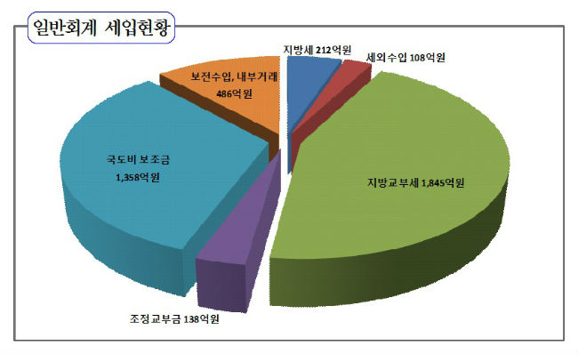 ÀϹÝȸ°è ¼¼ÀÔ¿¹»êÀº Áö¹æ¼¼ µî ÀÚü¼¼ÀÔÀÌ 320¾ï ¿ø(7.7%)À̰í, Áö¹æ±³ºÎ¼¼ µî ÀÇÁ¸Àç¿øÀÌ 3,341¾ï ¿ø(80.57%)ÀÌ´Ù. °ÅⱺÀÌ ÀÚÁÖÀûÀ¸·Î Àç·®±ÇÀ» °¡Áö°í »ç¿ëÇÒ ¼ö ÀÖ´Â ÀçÁ¤ÀÚÁÖµµ´Â 55.5%·Î, ÀçÁ¤¿î¿µÀÇ °ÇÀü¼ºÀÌ È®º¸µÈ ¿ì¼öÀÚÄ¡´Üü·Î ºÐ·ùµÈ °ÍÀ¸·Î ³ªÅ¸³µ´Ù.