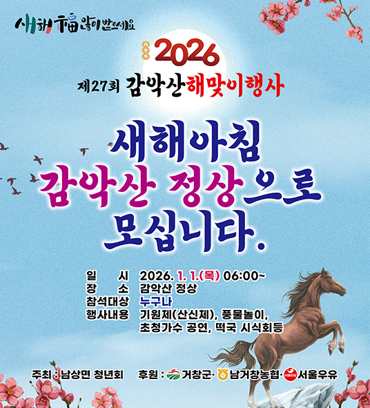 °ÅⱺÀº º´¿À³â(ܰçíÒ´) »õÇØ¸¦ ¸Â¾Æ ±º¹ÎÀÇ ¾È³ç°ú Áö¿ª ¹ßÀüÀ» ±â¿øÇÏ´Â ¡¸Á¦27ȸ °¨¾Ç»ê ÇØ¸ÂÀÌ Çà»ç¡¹¸¦ 2026³â 1¿ù 1ÀÏ(¸ñ) ¿ÀÀü 6½ÃºÎÅÍ 9½Ã±îÁö °¨¾Ç»ê Á¤»ó¿¡¼ °³ÃÖÇÑ´Ù.