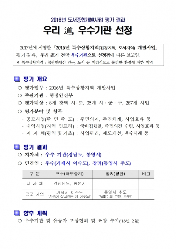 °æ³²µµ, µµ¼Á¾ÇÕ°³¹ß»ç¾÷ 3³â ¿¬¼Ó Àü±¹ ¿ì¼ö! 2015³âºÎÅÍ 2017³â±îÁö 3³â ¿¬¼Ó ¿ì¼ö ÁöÀÚü·Î Æò°¡․¼±Á¤ 2°³ ºÐ¾ß(³»¿ª»ç¾÷ ¹× °ø¸ð»ç¾÷)¿¡¼ Å뿵½Ã․°ÅÁ¦½Ã ¸ðµÎ ¿ì¼ö °ã°æ»ç